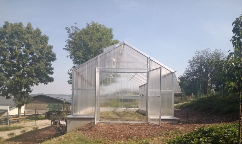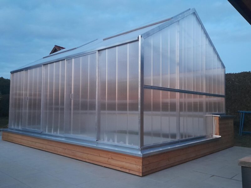 Für ein robustes Gewächshaus ist eine stabile Verglasung unabdingbar. Hierzu setzen wir auf Acryl-Doppelstegplatten. Diese lassen das für die Pflanzen so wichtige UV-Licht zu einem hohen Grad durch. Gleichzeitig verfärben sie sich nicht unter dem Einfluss von Sonnenstrahlen. Wichtig ist dabei, das Acryl nicht mit Alkohol oder Lösungsmitteln zu reinigen.